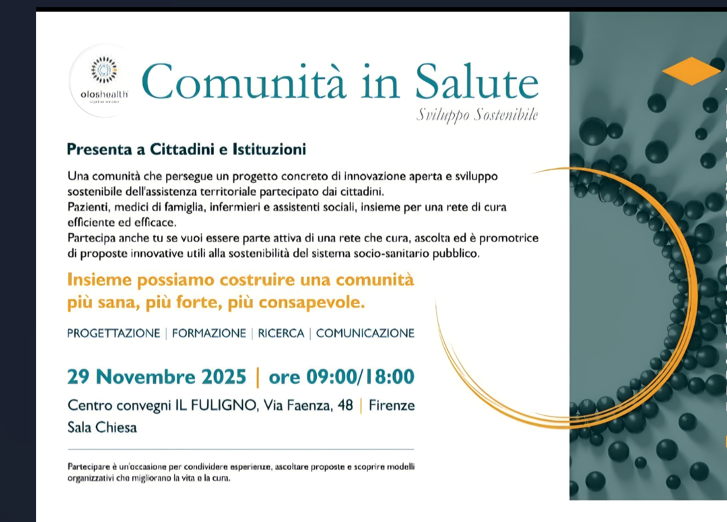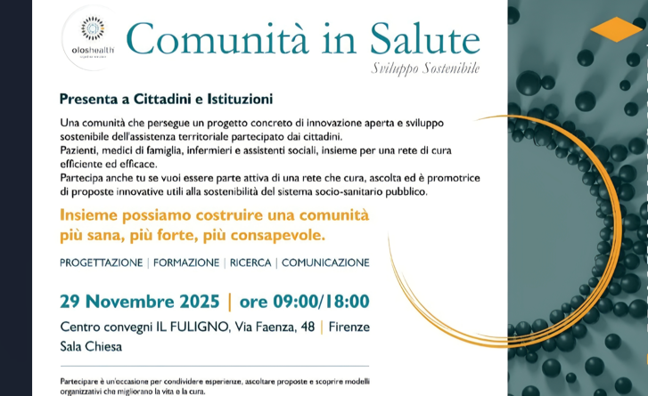 Come anticipato in un precedente articolo , si terrà il 29 novembre 2025 presso il Centro Convegni IL FULIGNO, a Firenze in via Faenza 48, il convegno finale del secondo anno del progetto Comunità in salute, dal titolo ‘RETI DI CURA: COME REALIZZARLE CON MMG, PAZIENTE E TEAM MULTIDISCIPLINARE, IN UN’OTTICA DI INNOVAZIONE APERTA E SOSTENIBILITA’ TRA OTTIMIZZAZIONE E INCLUSIONE’